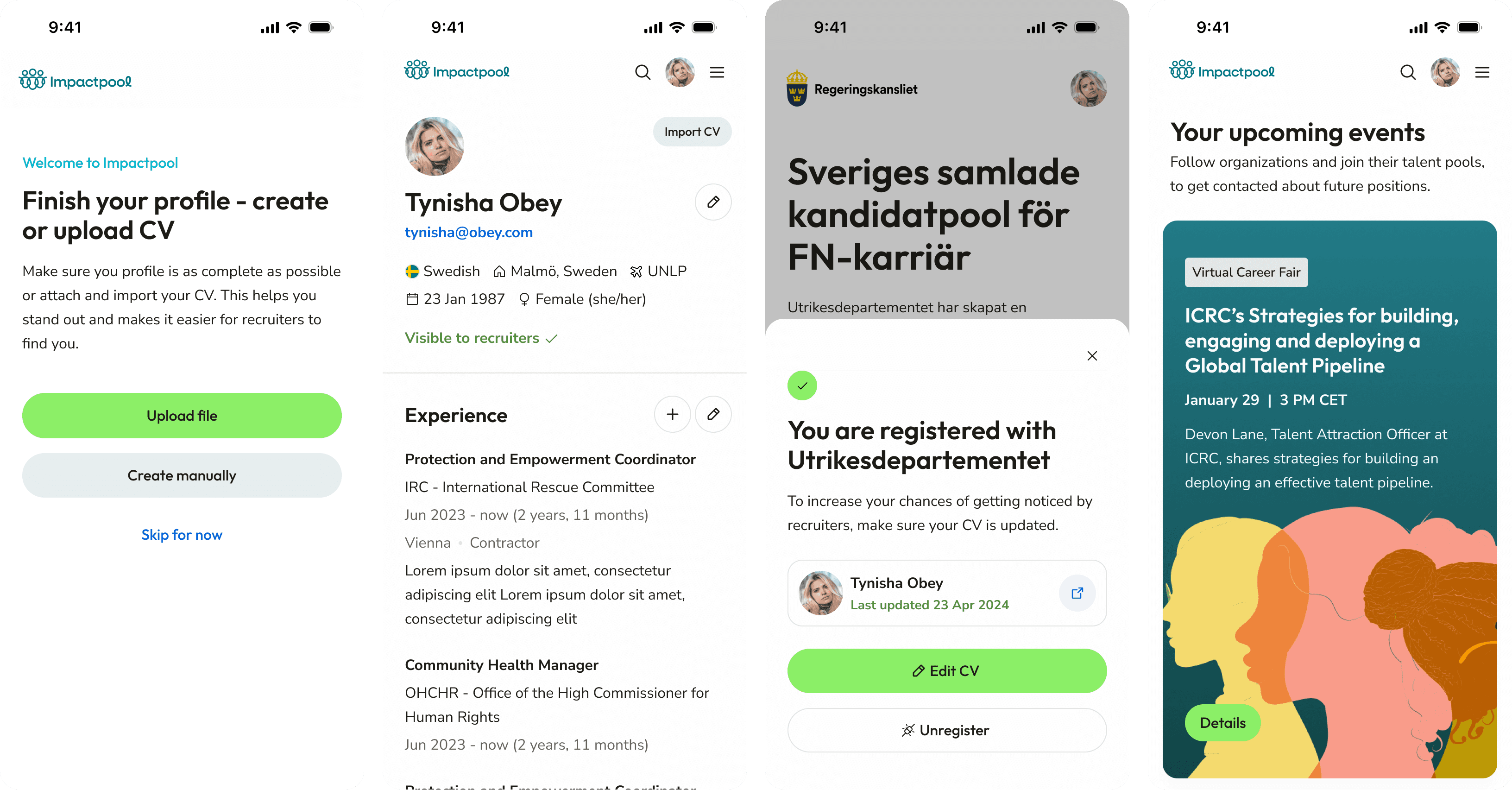 Users could import their CV, skip legacy data fields, and manage a consistent profile view used across jobs, events, and applications.
