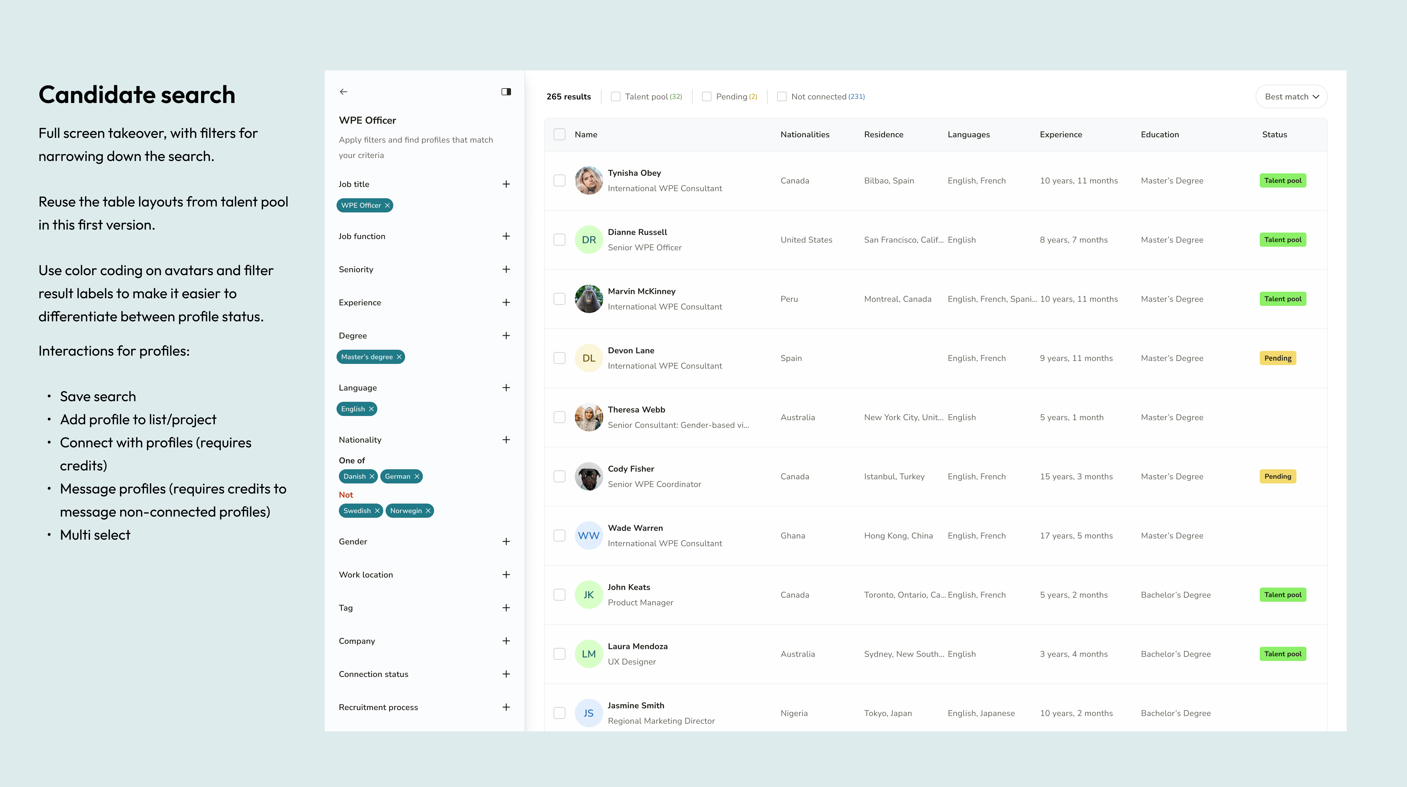We created a single search that combined all profiles, using visual indicators and contextual actions (connect, message).