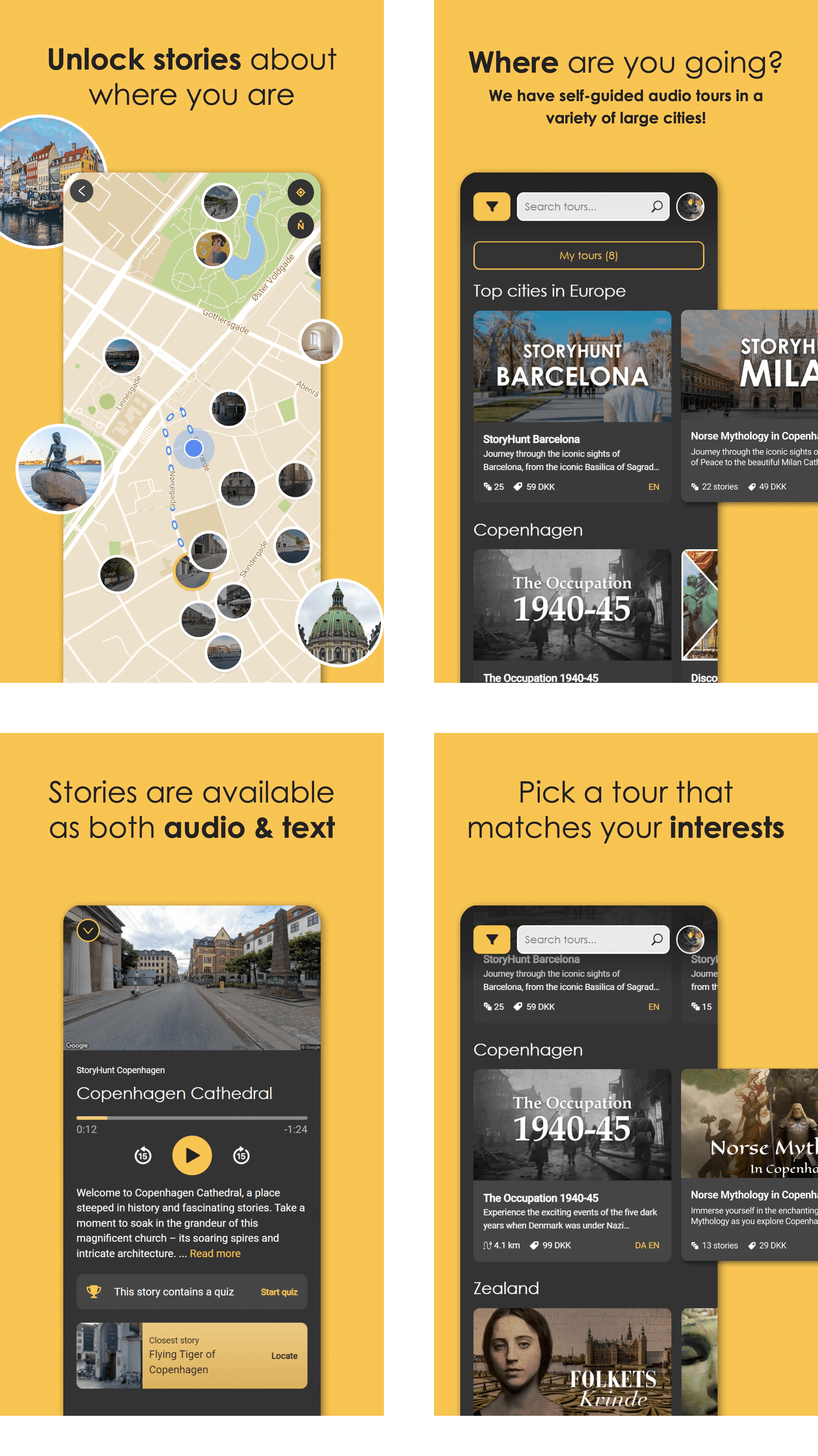 So instead of just showing available tours at a given location, we would ask the user about interests and show them points of interest. There would still be predefined routes and tours, but now you could also make your own tour or simply just listen to stories, without committing to a fixed route.